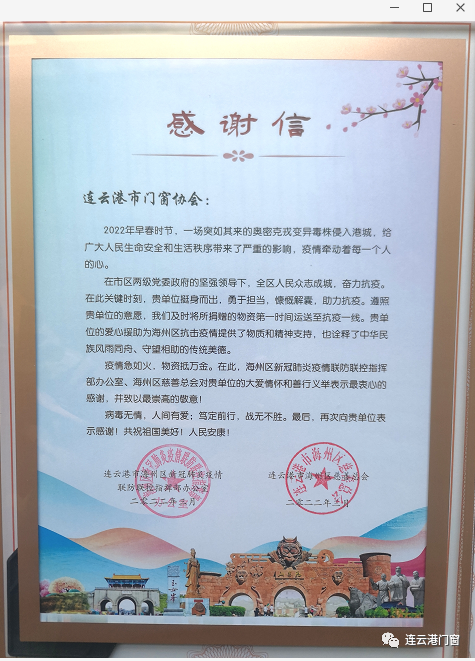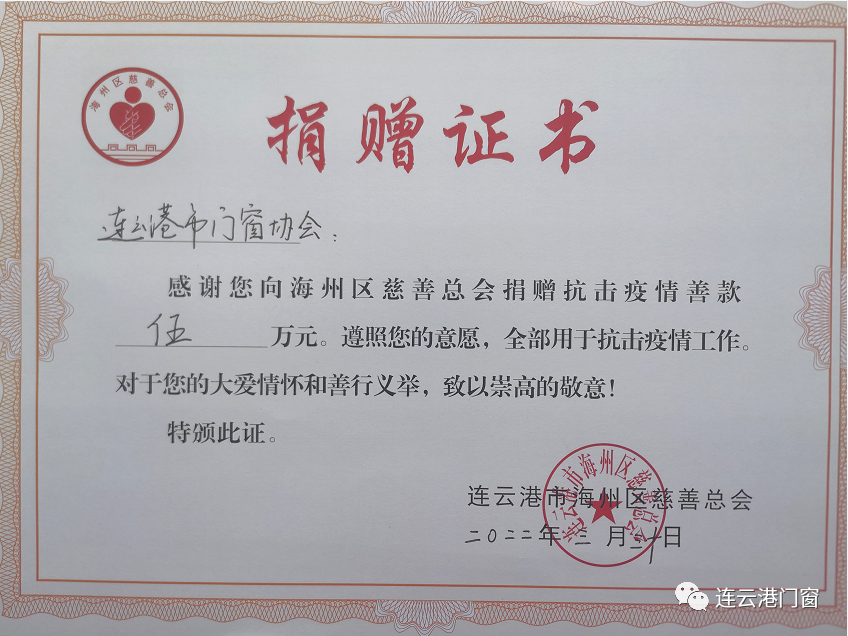 5月17日上午,連云港市海州區(qū)疫情防控指揮部辦公室、連云港市海州區(qū)慈善總會向連云港市門窗協(xié)會頒發(fā)“捐贈證書”、“感謝信”和“錦旗”。