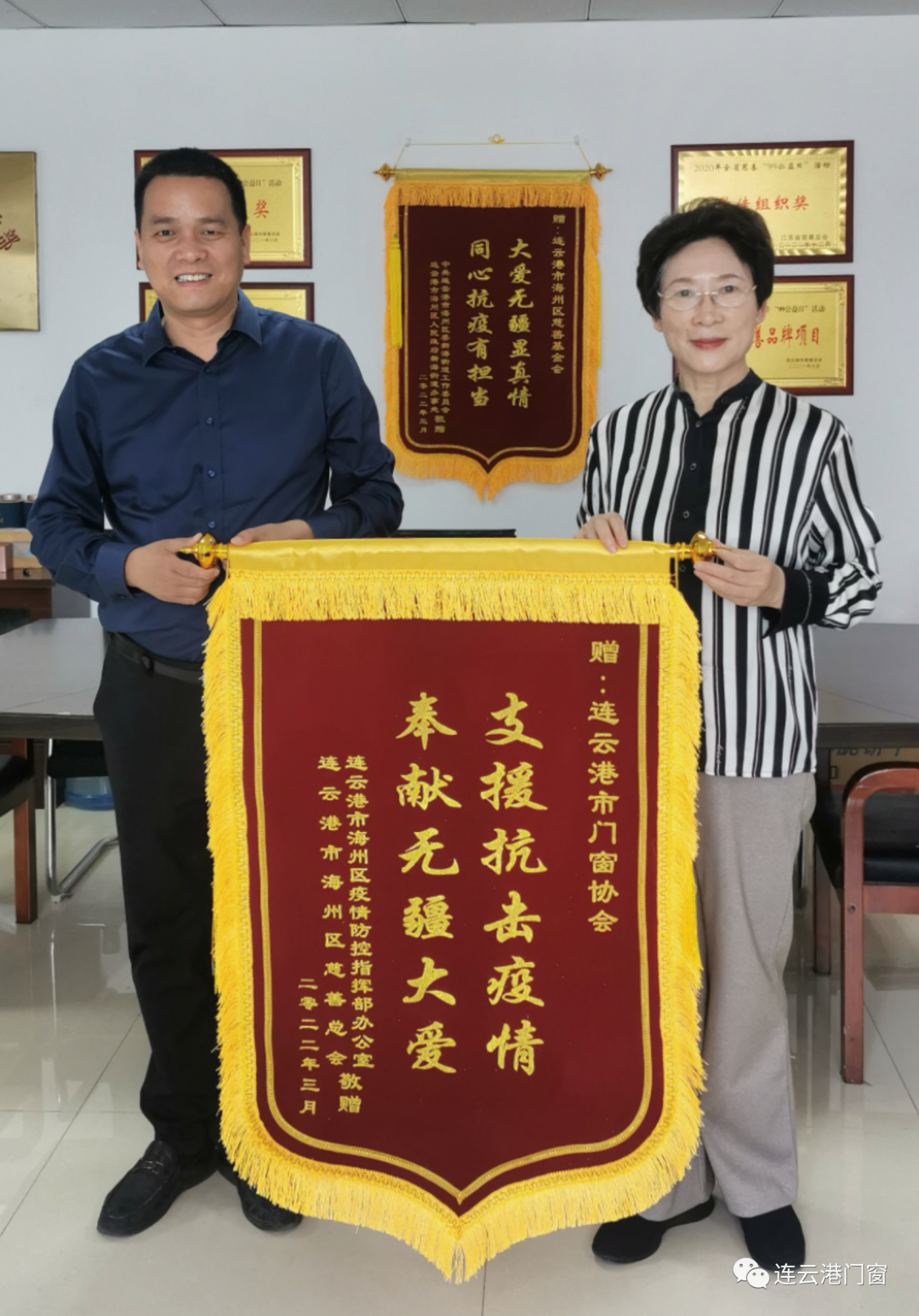 連云港市海州區(qū)政協(xié)副主席、區(qū)慈善總會會長顏景華向連云港市門窗協(xié)會黨支部書記、會長潘國柱頒發(fā)錦旗并合影留念。
