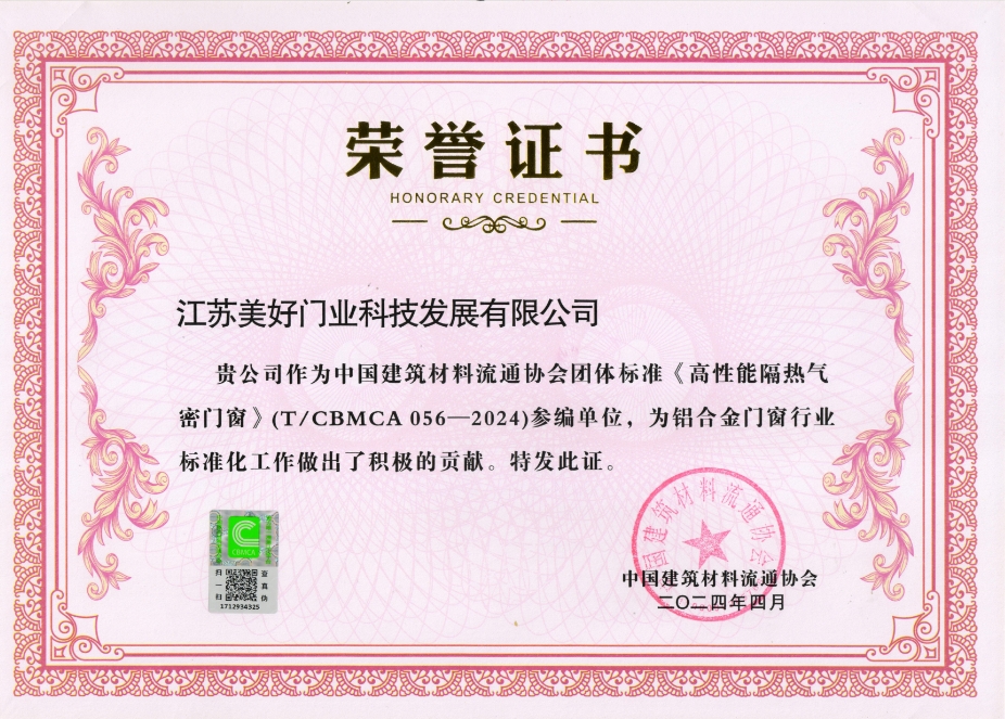 江蘇美好門業科技發展有限公司《 高性能隔熱氣密門窗》標準參編證書