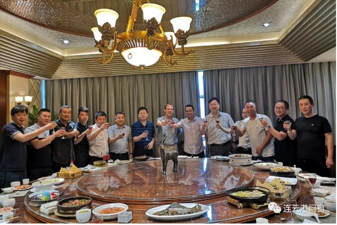 ????? 皇家建材集團領導熱情宴請了協會參觀人員,席間大家親切交流,并就接下來的長期合作達成共識,潘國柱會長一行還向皇家建材集團MR.Darren達人先生發出邀請,期待皇家集團來連云港做客。